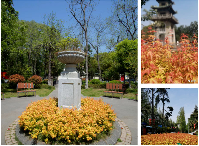 傳統(tǒng)色塊,無非綠,紅,黃三種顏色,“金禧”從萌芽到葉片成熟綻放,會(huì)經(jīng)歷多個(gè)變色階段,所以色塊隨著新葉的生長,會(huì)呈現(xiàn)多種色彩效果,并且層次遞進(jìn)是其他任何色塊苗木無法比擬的。